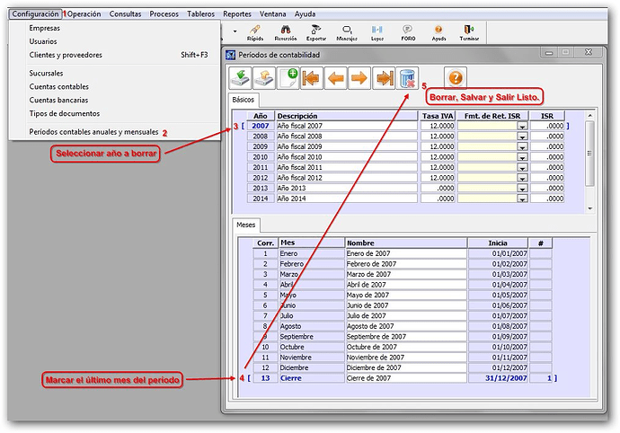 Espero esta respuesta no llegue muy tarde, he logrado borrar periodos anteriores al que estoy trabajando actualmente,siguiendo este procedimiento: Nota Importante “SI NO ESTA SEGURO NO REALICE EL MISMO” sugiero hacer backup y que lo ejecute solamente el administrador:
