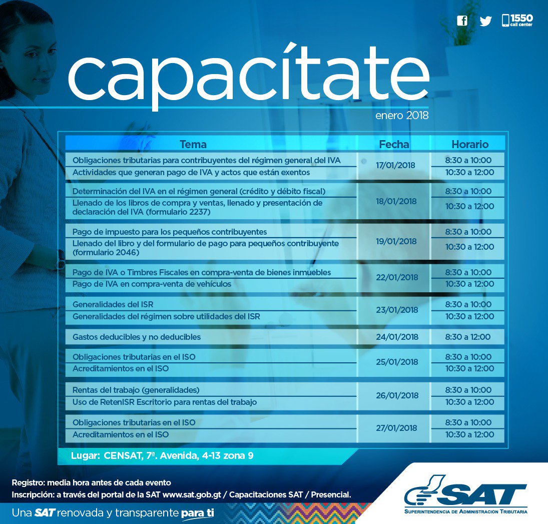 Recientemente la Administración Tributaria, ha publicado para el mes de enero varias capacitaciones, quienes están interesados pueden participar e inscribirse en el siguiente enlace: