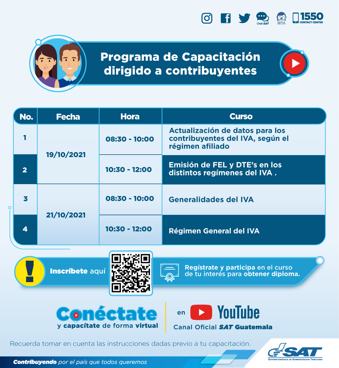 La Administración Tributaria ha publicado en su portal web las capacitaciones que desarrollará por medio de la plataforma de Youtube en la segunda quincena de octubre de 2021.