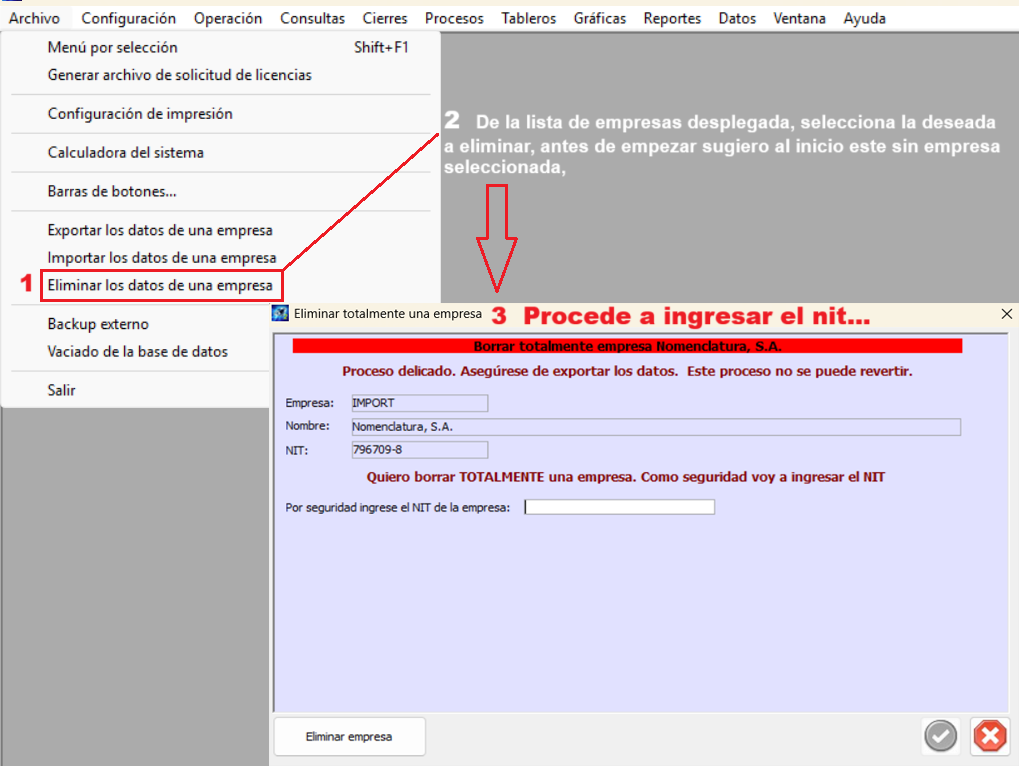 A continuación, los pasos para borrar la empresa, siempre sugiero tener una backup de su base de datos antes de proceder por aquello de las equivocaciones.