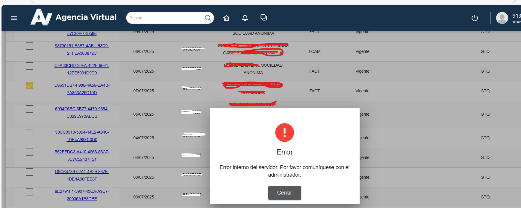 Me ha estado ocurriendo, lo que he hecho es recargar la página (F5), la cantidad de veces necesarias hasta que desaparece el error, o vuelvo a ingresar paso a paso desde el menú inicial.