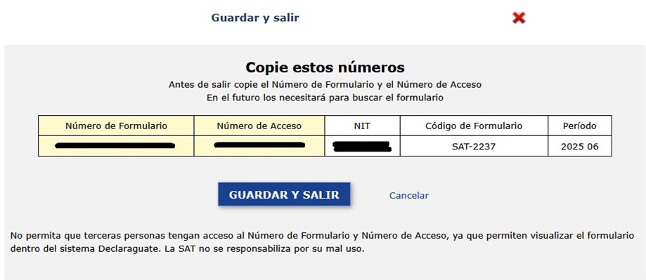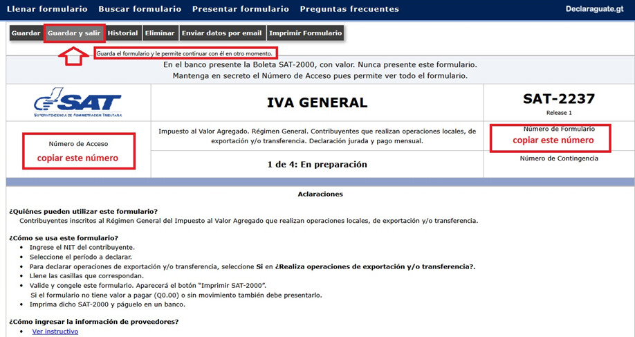 No obstante, la opción de guardar (con ciertas limitaciones) también está disponible en algunos de los formularios de Declaraguate generados desde agencia virtual, los cuales quedan guardados dentro de la agencia virtual y pueden ser consultados posteriormente por los contribuyentes (todavía no están funcionando al 100%, como es el caso del ISO)