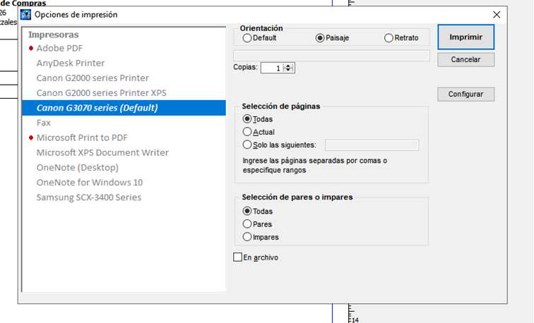 Ahora, al cambiar la impresora por una Canon serie G3070, el problema se ha repetido. Durante los primeros días pude imprimir sin dificultad, pero nuevamente los reportes dejaron de imprimirse. Ya verifiqué que en Diamante Contador la impresora esté configurada como predeterminada y, además, en cada reporte confirmo en configuración y en las opciones de cada reporte, que ésta sea la impresora seleccionada para la impresión; aun así, no obtengo respuesta.