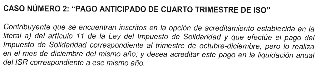 EL 31 DE ENERO DE 2017 SE EFECTUO EL PAGO DEL ISO DEL TRIMESTRE OCTUBRE - DICIEMBRE DEL 2016 POR Q750.00, ESTE ISO SE PUEDE ACREDITAR HASTA EL AÑO 2018, 2019 Y 2020