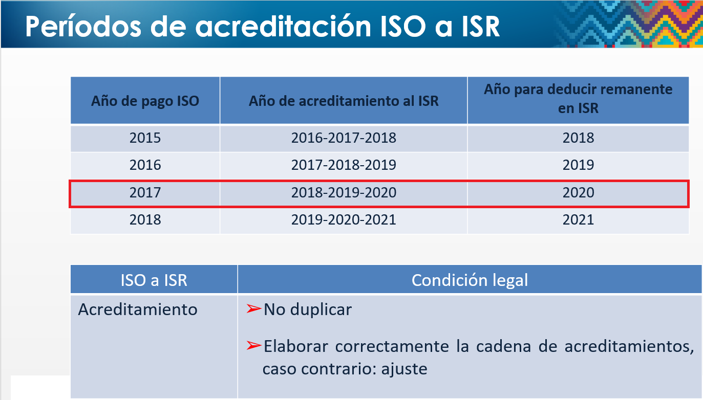 En el supuesto que en el 2017 la empresa hace la presentación de los tres pagos trimestrales, sin embargo en el primer trimestre del ISR (enero - marzo) hace uso de una parte del ISO que pago en el 2016 para acreditarlo al ISR, ejemplo: